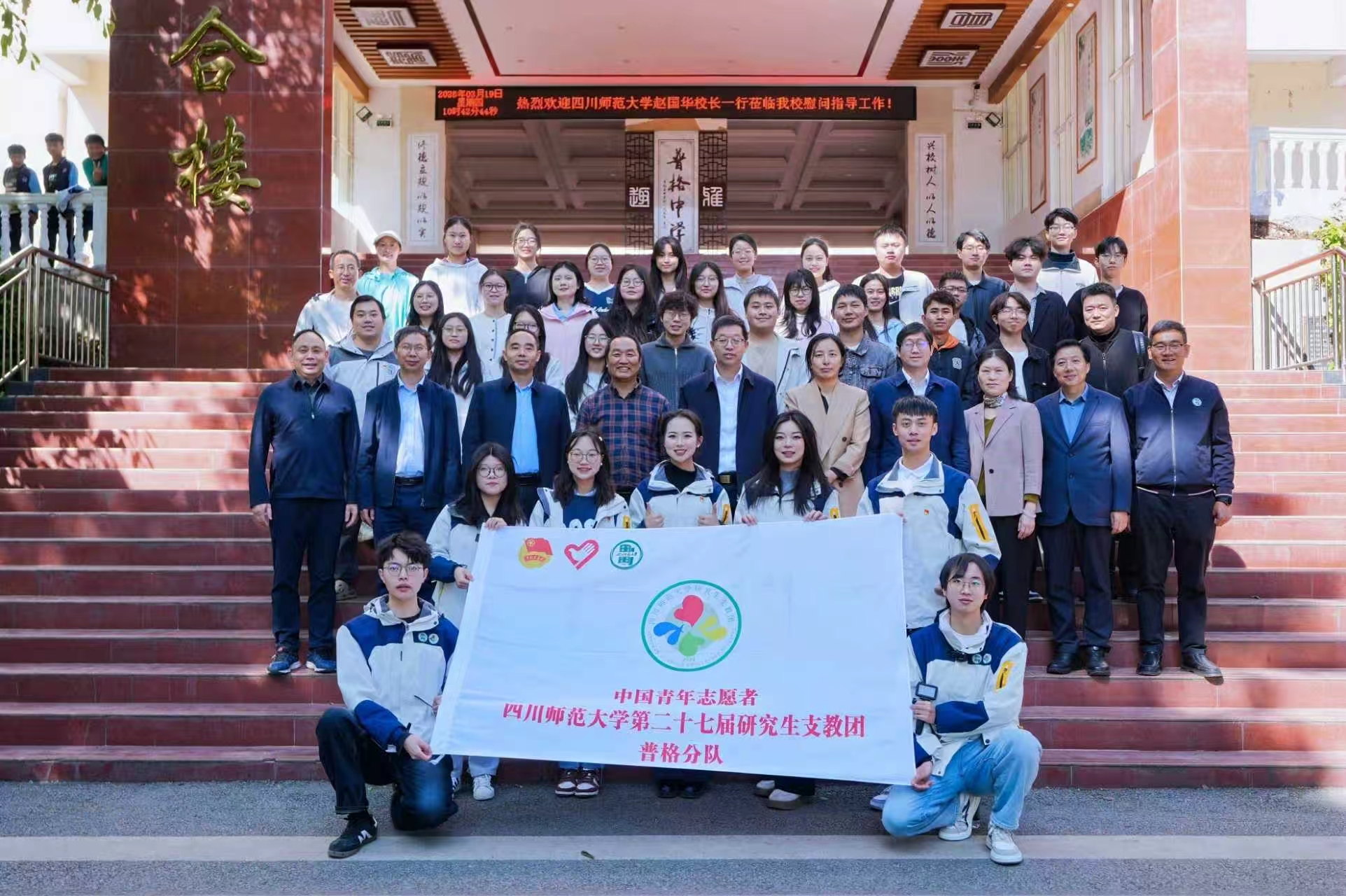 2026年3月19日,四川师范大学党委副书记、校长赵国华,党委常委、副校长康胜带领相关职能部门负责人一行,深入凉山州普格县夹铁镇,亲切看望慰问学校派驻当地的驻村工作队队员及顶岗支教学生,后勤保障部部长刘东随行参加了此次慰问。