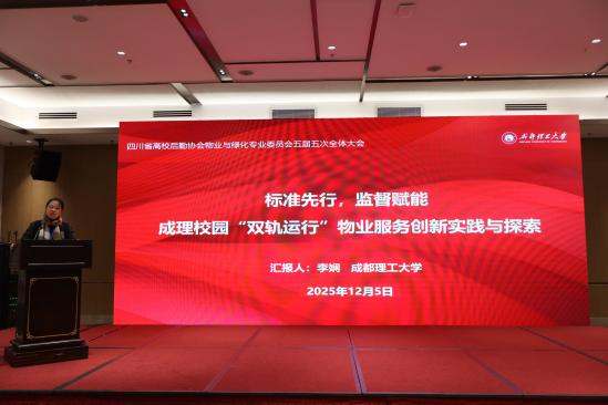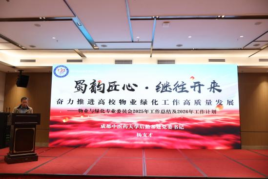 成都中医药大学后勤基建党委书记杨支才作《蜀韵匠心・继往开来》年度工作报告,全面总结了 2025 年物专会工作成果,明确 2026 年重点工作方向。公布了第一届 “四川高校物业与绿化典型案例”评选结果,四川农业大学、成都理工大学、泸州职业技术学院3所高校代表分享了校园物业绿化工作经验。