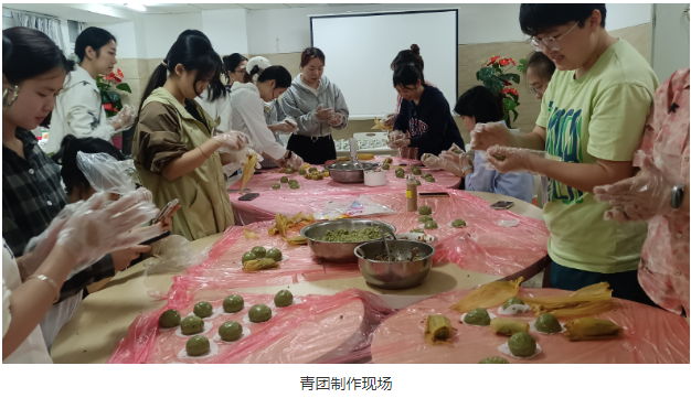 在公寓管理员的指导下,学生们学习了青团的制作方法,包括如何选择和处理艾草,如何调制馅料,以及如何包裹和蒸煮青团。活动现场洋溢着欢声笑语,大家都表现出了极高的兴趣和热情。计科院2023级的段其其同学说:“自己做的青团,那种滋味是外面买不到的!这次活动太有意义了,希望社区以后能经常举办此类活动。”
