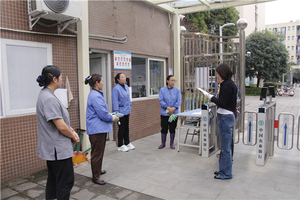 考核在早晨日常保洁工作刚刚结束后随即展开,真实检验了保洁工作的日常水平。各检查小组严格依据《保洁质量考核方案》及评分细则,对清洁工具摆放、区域卫生状况、操作规范等近二十个细节项目进行考核评分。考核结束,保洁员当场签字确认考核结果。