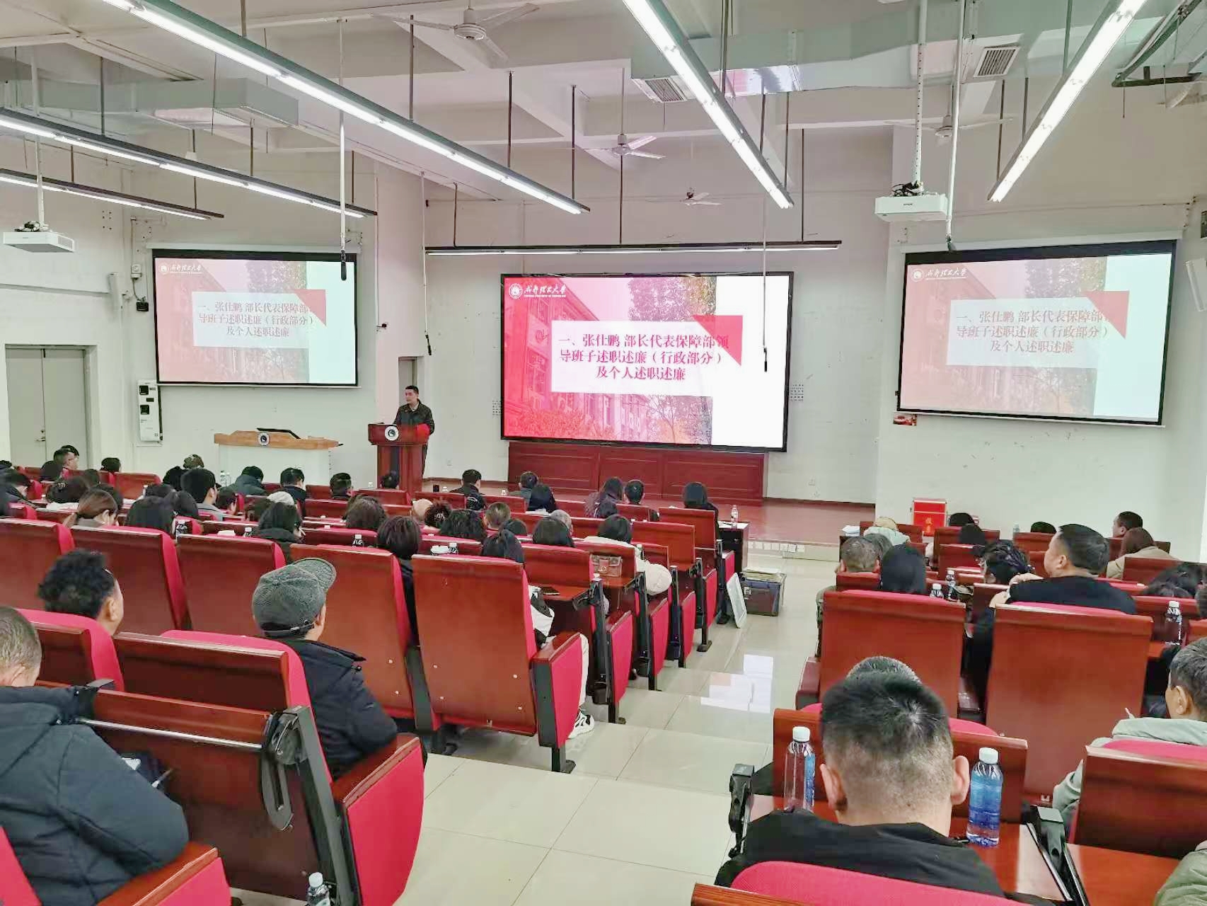 为全面检验处科级干部履职效能,压实责任担当、强化队伍建设,后勤保障部于12月8日下午组织召开了2025年度处科级干部述职述廉及民主测评会。会议由副部长程锋主持,学校考核工作组张洪林、吴强、李莉全程列席会议。后勤保障部全体处科级干部、正式员工、文员及以上人员共计116人参加述职测评会。