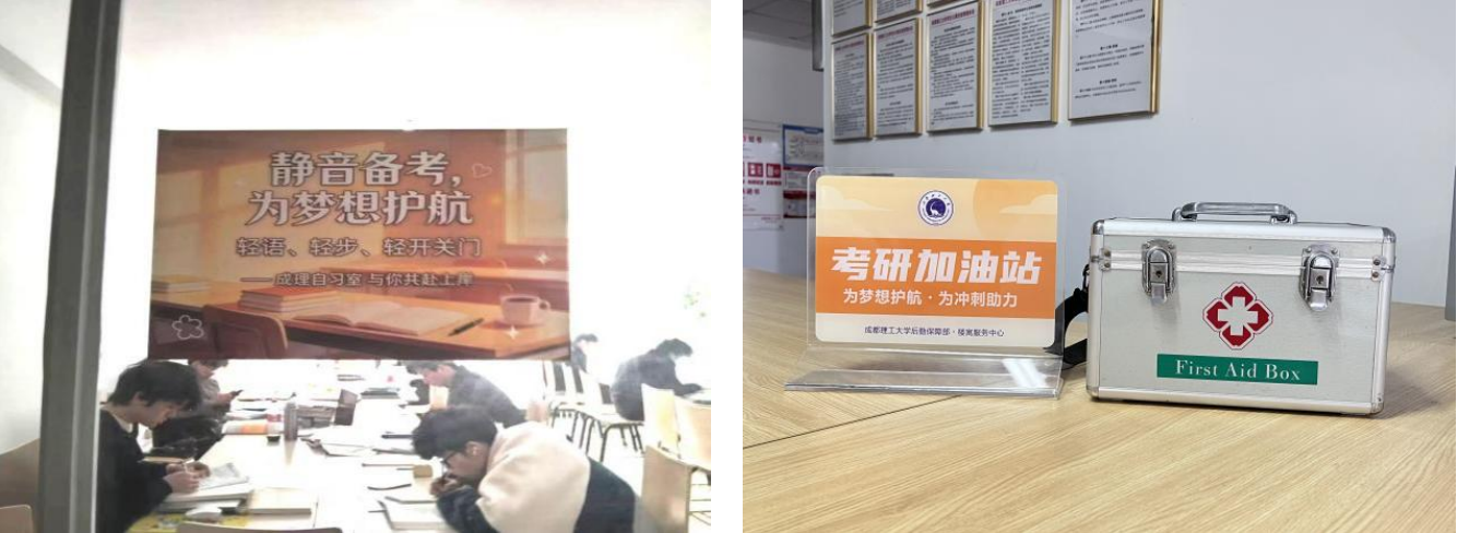 为缓解考生身心压力,12月15日至19日,中心推出多重福利。300份“成理研途加油包”陆续发放,内含能量补给、保暖物资与实用学习工具等物品,定制贴纸承载着“愿你笔锋所至,梦想开花”的真挚祝福。同时,延长自习室开放时间并张贴提示“安静备考”;专属“考研晨读角”等为考研学子提供沉浸式学习空间,让晨读声成为校园里最动人的奋进旋律。