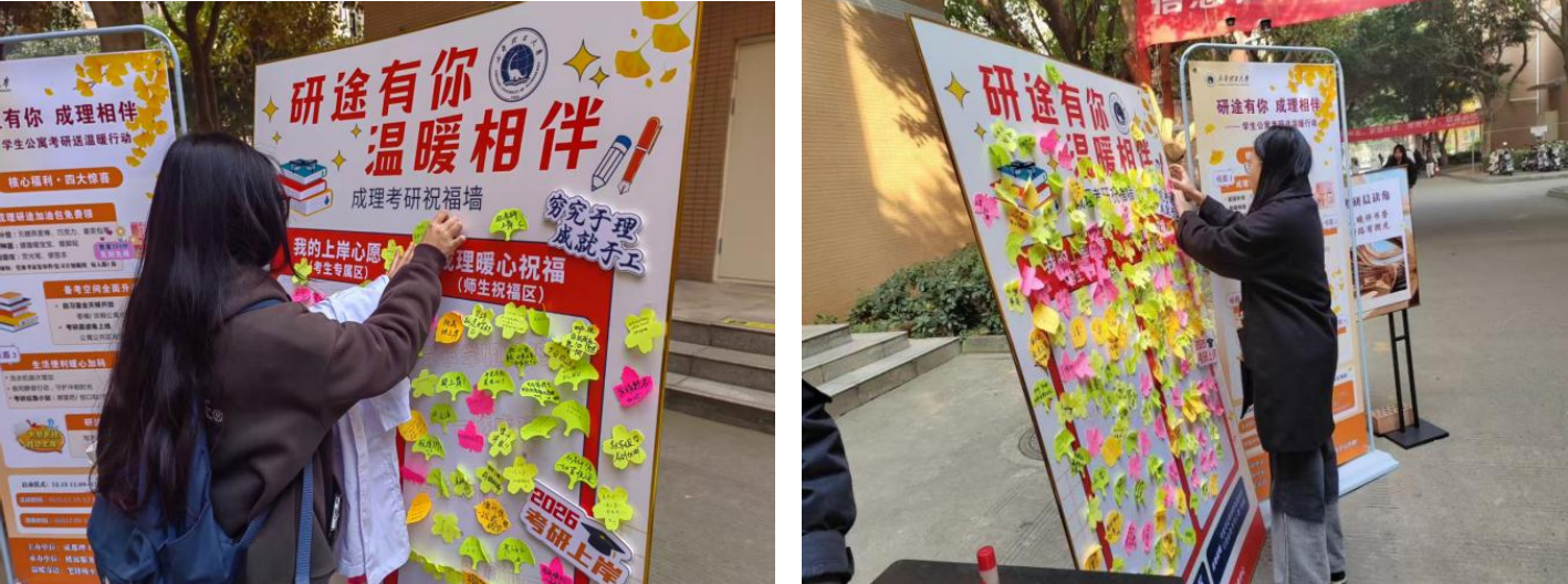 生活保障方面,中心全方位优化服务:一是积极协调热水供应、自助洗衣服务、控电维保、空调维修和电梯维保等外包服务公司强化服务维修保障,解决备考学子生活后顾之忧;二是加强夜间巡逻力度保安全;三是主动对接校医院备齐常用药品;四是采购雨伞等物资,随时响应突发需求。各园区精心搭建的“研途有你・温暖相伴”祝福墙,更是成为校园暖心地标 —— 工作人员率先写下鼓励寄语,考生们纷纷执笔抒发心愿、互送祝福,字里行间满是坚守与期盼,汇聚成互助友爱的温暖海洋。