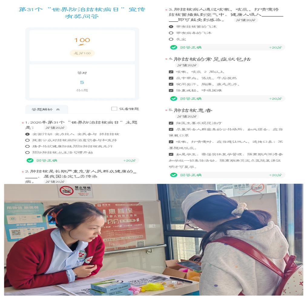 活动设置的线上答题小程序颇受师生欢迎,扫码即可参与,题目围绕结核病传播途径、典型症状、防治要点展开,不少同学还自发分享链接,让大家在轻松氛围中掌握防护知识。同时,医院还向师生普及了结核防治核心知识点,提醒警惕咳嗽咳痰2周以上等核心症状,牢记均衡作息、勤通风等预防措施,知晓疑似症状免费检查、确诊后享免费抗结核药物的国家政策。