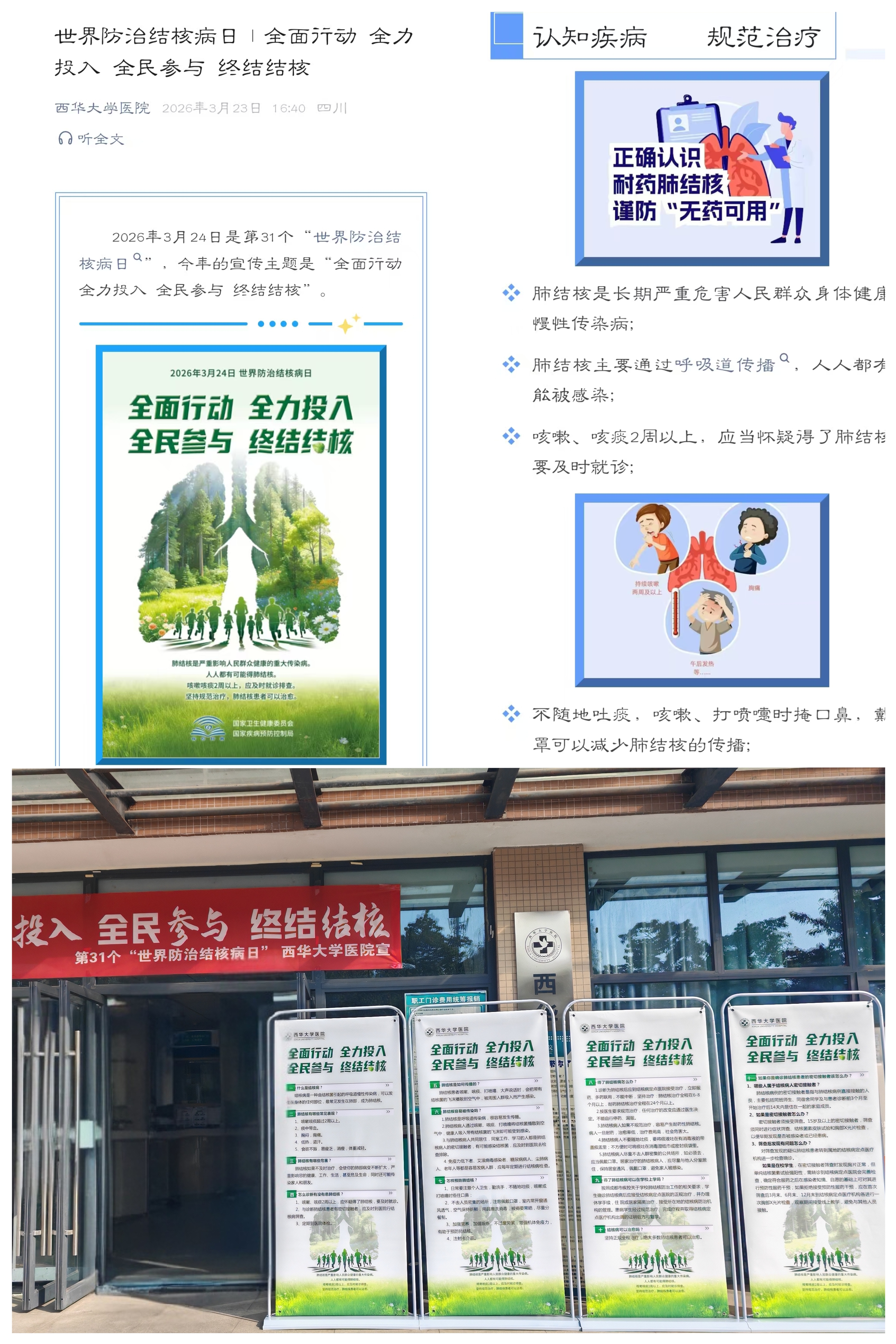 2026年3月24日是第31个世界防治结核病日,围绕我国“全面行动 全力投入 全民参与 终结结核”的宣传主题,西华大学医院开展结核病防治主题宣传活动,通过线上线下结合的形式普及防治知识,筑牢校园健康防护屏障。