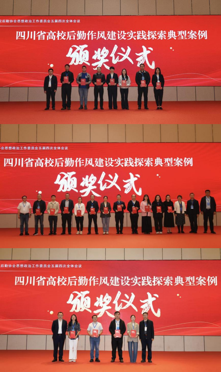 会议为“四川省高校后勤作风建设实践探索典型案例”获奖代表颁发荣誉证书。本次评选旨在树立高校后勤作风建设标杆,营造创先争优良好氛围,推动作风建设走深走实、见行见效。