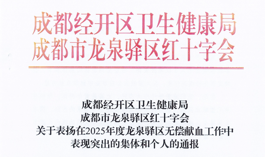 近日,成都经开区卫生健康局、成都市龙泉驿区红十字会对2025年度在无偿献血工作中作出突出贡献的集体和个人进行了通报表扬。成都航空职业技术大学荣获“2025年度龙泉驿区无偿献血工作表现突出集体”称号;邵明志同志获评“2025年度龙泉驿区无偿献血工作表现突出个人”。